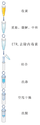 內(nèi)毒素(Endotoxin)是革蘭氏陰性菌細(xì)胞壁上的一種脂多糖,它能引起哺乳動物發(fā)熱,甚至?xí)?dǎo)致動物休克。常規(guī)的質(zhì)粒純化試劑盒由于無法去除內(nèi)毒素的污染,從而大大降低了質(zhì)粒轉(zhuǎn)染的效率。Omega公司采用獨(dú)特的內(nèi)毒素吸附緩沖液(ETR Solution),能有效去除質(zhì)粒中的內(nèi)毒素污染,純化的質(zhì)粒中內(nèi)毒素含量小于0.1EU/µg,可大大提高轉(zhuǎn)染實驗效率和動物注射效果。從培養(yǎng)過夜的菌液中收集細(xì)菌后,采用經(jīng)典的堿裂解法裂解細(xì)菌,離心去除染色體DNA和蛋白質(zhì),得到含有質(zhì)粒和內(nèi)毒素的上清液,加入ETR Solution吸附內(nèi)毒素,得到不含內(nèi)毒素的上清液,調(diào)節(jié)結(jié)合條件并轉(zhuǎn)移至硅膠柱,離心吸附質(zhì)粒DNA,經(jīng)兩種溶液洗滌去除殘余蛋白質(zhì)和各種雜質(zhì),最后用Endotoxin-free Elution Buffer洗脫出質(zhì)粒DNA。
