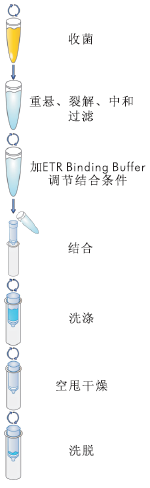 從培養(yǎng)過(guò)夜的菌液中收集細(xì)菌后,采用經(jīng)典的堿裂解法裂解細(xì)菌,離心去除染色體DNA和蛋白質(zhì),得到含有質(zhì)粒和內(nèi)毒素的上清液,加入ETR Binding Buffer吸附去除內(nèi)毒素并調(diào)節(jié)結(jié)合條件并轉(zhuǎn)移至硅膠柱,離心吸附質(zhì)粒DNA,經(jīng)三種溶液洗滌去除殘余蛋白質(zhì)和各種雜質(zhì),最后用 Endotoxin-Free Elution Buffer洗脫出質(zhì)粒DNA。