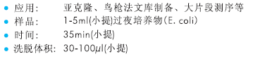 小提試劑盒適合于從1-5ml細菌培養(yǎng)液中純化大分子量的質(zhì)粒載體,或各種BAC,PAC,粘粒,Cosmid等載體。細菌收集后,加入Buffer T1/T2裂解,再加入Buffer T3離心沉淀去除蛋白質(zhì)和染色體DNA,在得到的上清液中加入獨特的結(jié)合液并轉(zhuǎn)移至結(jié)合柱進一步去除蛋白質(zhì),經(jīng)過簡單的兩次洗滌即可得到高純度的BAC/PAC/P1等大片段質(zhì)粒DNA。