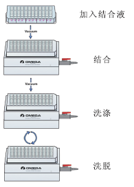 用結(jié)合緩沖液(Buffer CP)同PCR產(chǎn)物混合后轉(zhuǎn)移到96孔板中,離心或真空抽濾使其過(guò)濾,單鏈或雙鏈DNA結(jié)合到HiBind®基質(zhì)中,而引物,引物二聚體及小于50bp的片段,酶等雜質(zhì)隨濾液一起濾出,再經(jīng)兩步快速洗滌后,純化的PCR產(chǎn)物用無(wú)菌水或Elution Buffer洗脫。
