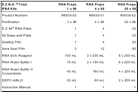 E.Z.N.A.® Total RNA Kit II (R6934)一樣的原理,該試劑盒專門設(shè)計(jì)高通量地從96個(gè)培養(yǎng)細(xì)胞樣品或動(dòng)物軟組織樣品中提取總RNA。每一個(gè)孔可處理高達(dá)5x106培養(yǎng)細(xì)胞或<30mg的動(dòng)物組織或 <50mg的植和組織。純化的RNA可直接用于各種下游應(yīng)用。