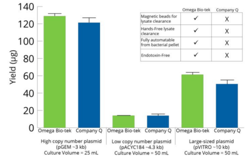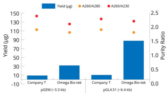 按照說明書操作步驟,使用磁珠法無內(nèi)毒素質(zhì)粒中型試劑盒以及競品公司的試劑盒,從DH5α培養(yǎng)基(n=3)中提取不同類型和大小的質(zhì)粒。使用Thermo Scientific 的NanoDrop™ 2000c分光光度計(jì)對提取的質(zhì)粒DNA進(jìn)行測定。所有質(zhì)粒產(chǎn)量均具有可比性,上圖顯示Omega Bio-tek試劑盒優(yōu)于競品公司試劑盒。