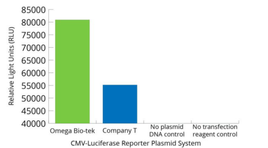 從5mL DH5α培養(yǎng)基(n=3)制備質(zhì)粒pGL4.51,并使用MagBinder® Fit24核酸提取儀上的磁珠法質(zhì)粒中量提取試劑盒與競品公司的等效試劑盒進(jìn)行提取。使用2μL Lipofectamine轉(zhuǎn)染試劑,將200ng提取好的質(zhì)粒轉(zhuǎn)染到10,000個(gè)細(xì)胞中。使用Omega Bio-tek試劑盒提取的質(zhì)粒生物發(fā)光信號更高,與競品公司相比,轉(zhuǎn)染效率更高。