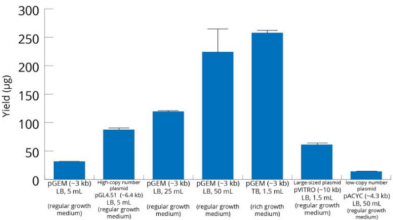 磁珠法無內(nèi)毒素質(zhì)粒中量提取試劑盒可處理各種樣品初始條件,如不同質(zhì)粒類型、分子量、培養(yǎng)基以及初始培養(yǎng)體積。質(zhì)粒產(chǎn)量可能因條件不同而存在差異。